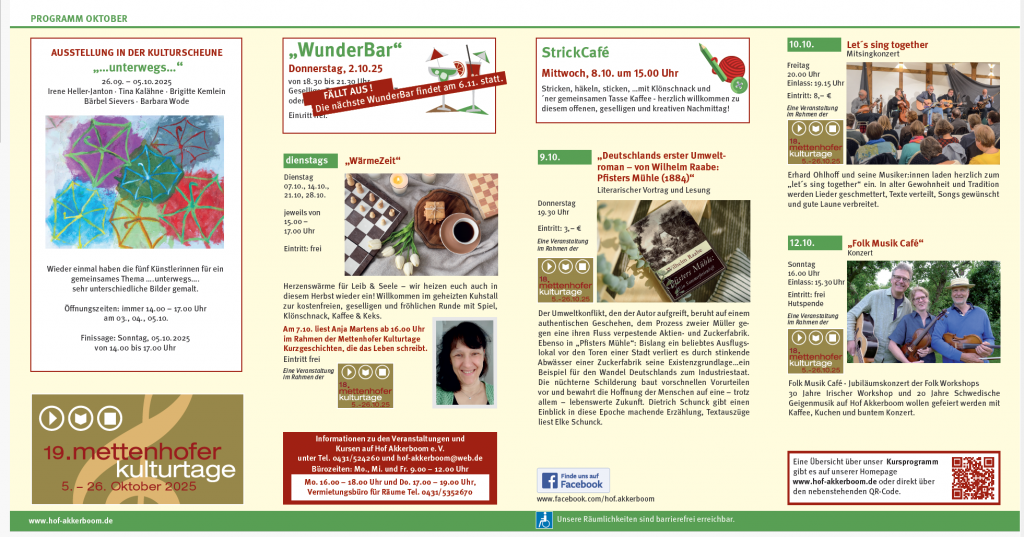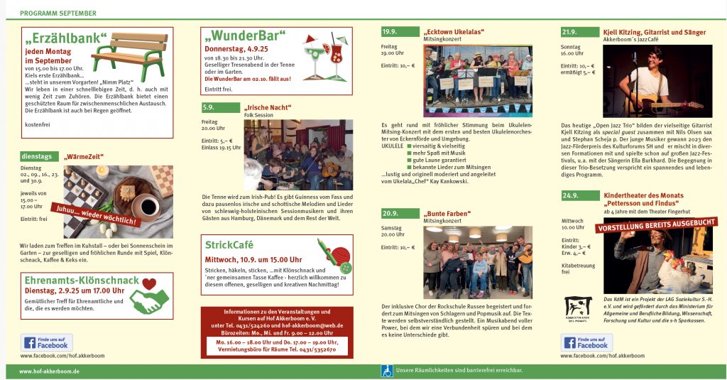 Im November 2021 wird es eine plattdeutsche Woche auf Hof Akkerboom geben, welche von einer Ausstellung begleitet wird. So sind ALLE aufgerufen, Fotos „Aussichten einer Bank“ einzusenden, egal wo in Schleswig-Holstein, egal ob Tag oder Nacht, egal in welcher Jahreszeit,… ABER es sollte immer ein Stück der Bank mit auf dem Foto sein. Wir hoffen auf viele Einsendungen bis zum 1. Oktober 2021.